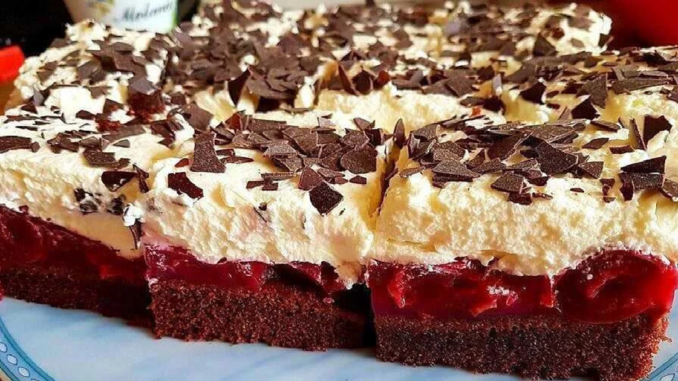 Švarcvaldský koláč na plech je šikovná domáca verzia slávneho dezertu, ktorá sa pripravuje oveľa jednoduchšie než klasická vrstvená torta. Na jednom plechu získate nadýchaný čokoládový korpus, šťavnatú višňovú vrstvu a ľahký šľahačkový krém, ktorý sa dokonale dopĺňa s čokoládovými hoblinkami.