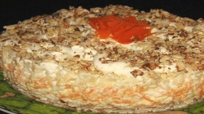 4. Dokončenie: Povrch šalátu posypte nasekanými vlašskými orechmi.