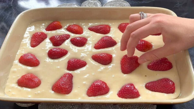 4️⃣ Cesto nalejte do formy a rovnomerne rozotrite. Jahody umyte, očistite, väčšie prekrojte a rozložte na povrch cesta. Jemne ich zatlačte dovnútra.